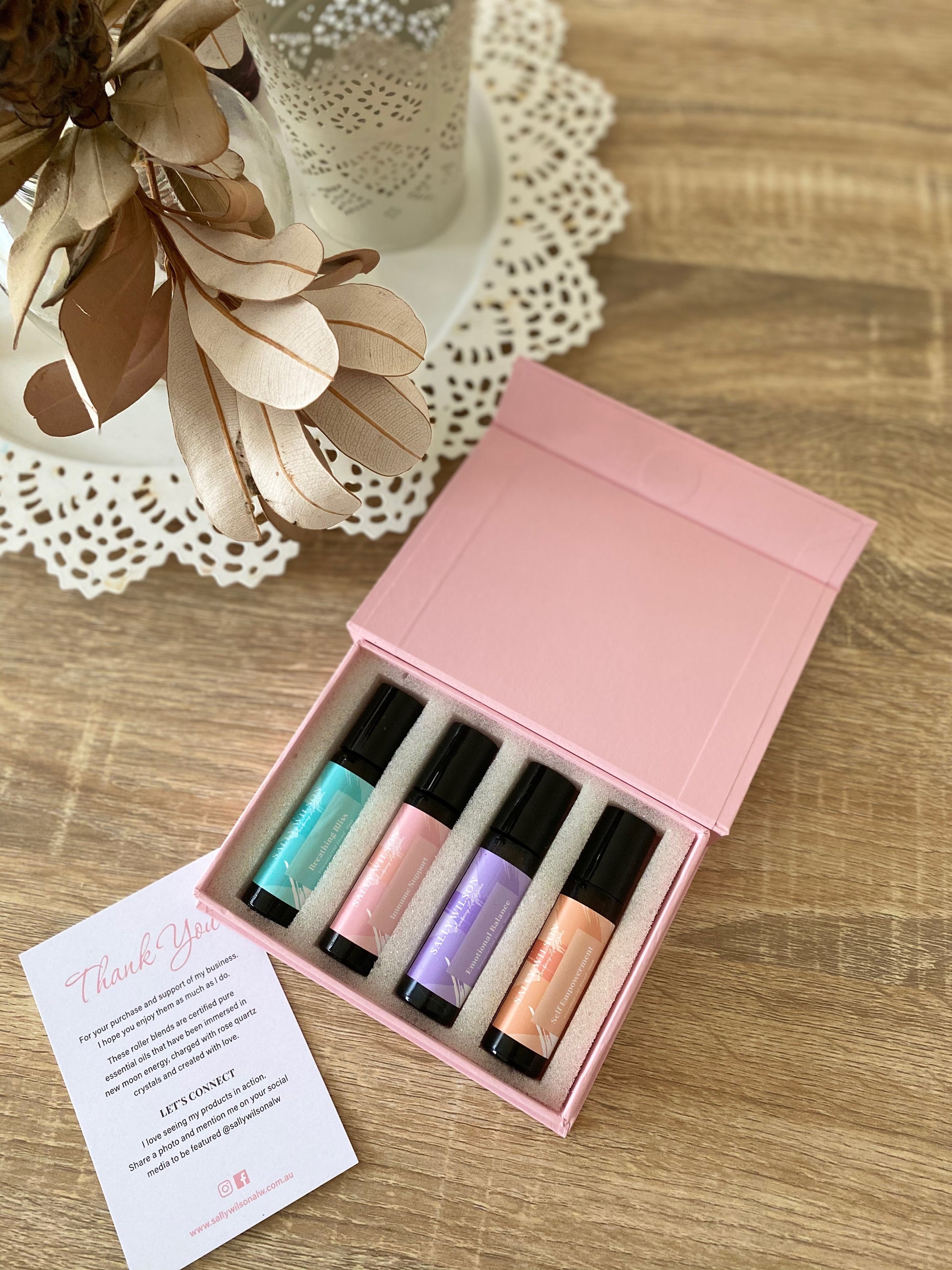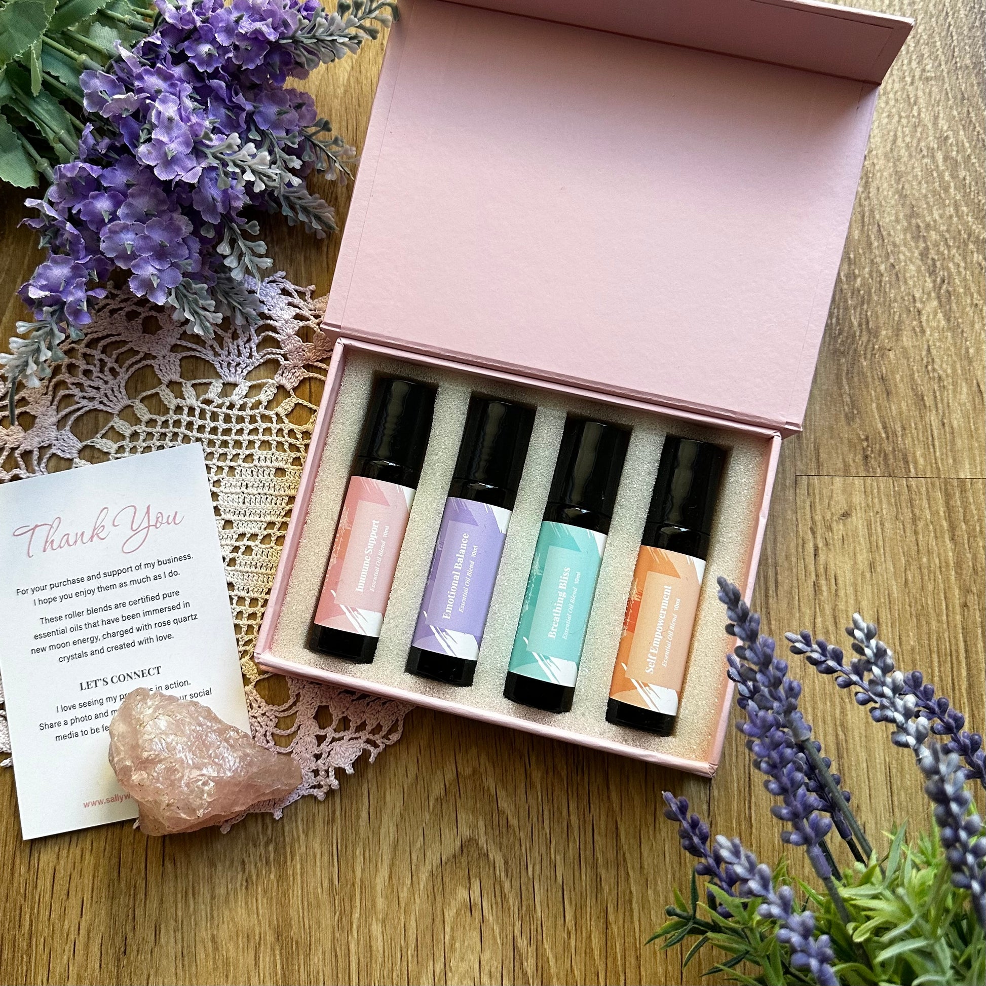 Have the benefits of aromatherapy with you on the go! The Essential Four kit contains certified pure essential oils that have been immersed in new moon energy, charged with rose quartz crystals and created with love for therapeutic benefits.